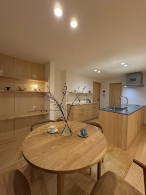 ・木のキッチンと建具が映える、明るくナチュラルな空間